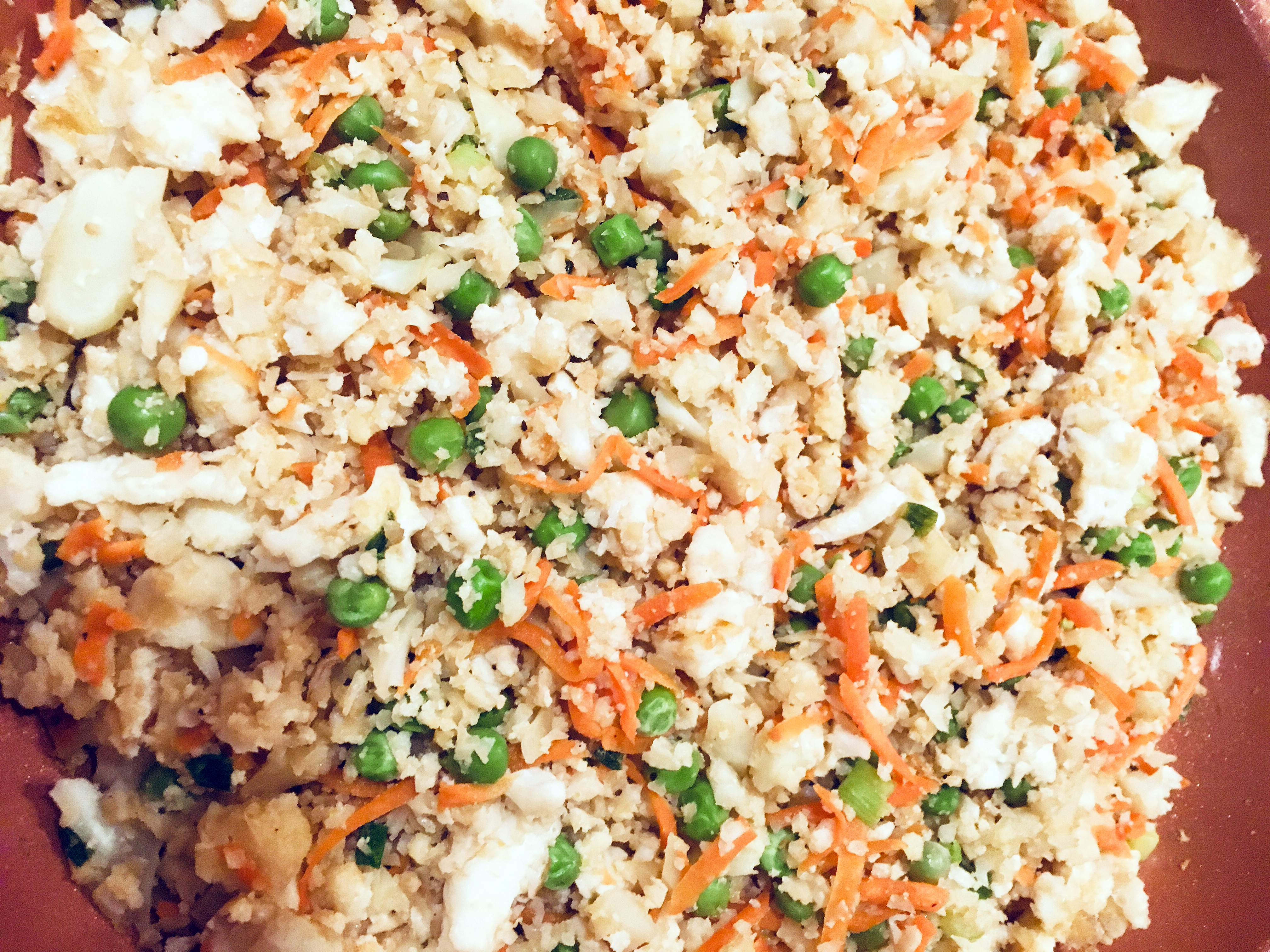 Coarsely chop the cauliflower into florets, then place half of the cauliflower in a food processor and pulse until the consistency of rice. Set aside and repeat with the remaining cauliflower. Shred one carrot in the food processor or dice (I used shredded carrot). Combine egg and egg whites in a small bowl and beat with a fork. Season with salt. Heat a large non-stick pan or wok over medium heat, then add olive oil. Add the eggs and cook, turning a few times until set; set aside. Add the sesame oil and sauté scallion whites, peas and carrots and garlic about 3 to 4 minutes, or until soft. Add red pepper flakes and garlic and sauté one additional minute. Raise the heat to medium-high. Add the cauliflower “rice” and soy sauce to the pan. Mix, cover and cook approximately 5 to 6 minutes, stirring frequently, until the cauliflower is slightly crispy on the outside but tender on the inside. Add the egg then remove from heat and mix in scallion greens. Serve immediately.